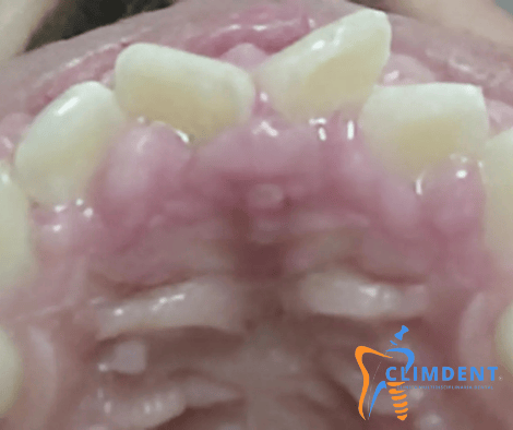 El siguiente ejemplo muestra un caso con agrandamientos gingivales múltiples asociados al uso de difenilhidantoína, un medicamento anticonvulsivo. La condición fue tratada exitosamente mediante gingivoplastía, logrando una notable mejora estética y funcional en el contorno gingival.